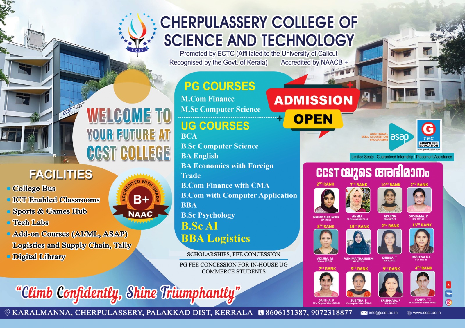 Cherpulassery College of Science and Technology is a self-financing arts and science college affiliated to Calicut University. The institution was established in 2010 by a group of social workers, health activists and educationalists under the auspices of Educational and Charitable Trust, Cherpulassery. The college is located at the hub of a sprawling 10.5 acres of land, with the added attraction of a salubrious and scenic setting, with ridges of hillock and rivulet bubbling and murmuring away behind it. The campus set in salubrious hush green surroundings is in close vicinity of the sacred river “KunthiPuzha” (Kunthi Devi, Mother of Pandavas had taken bath in the river and thus the name).